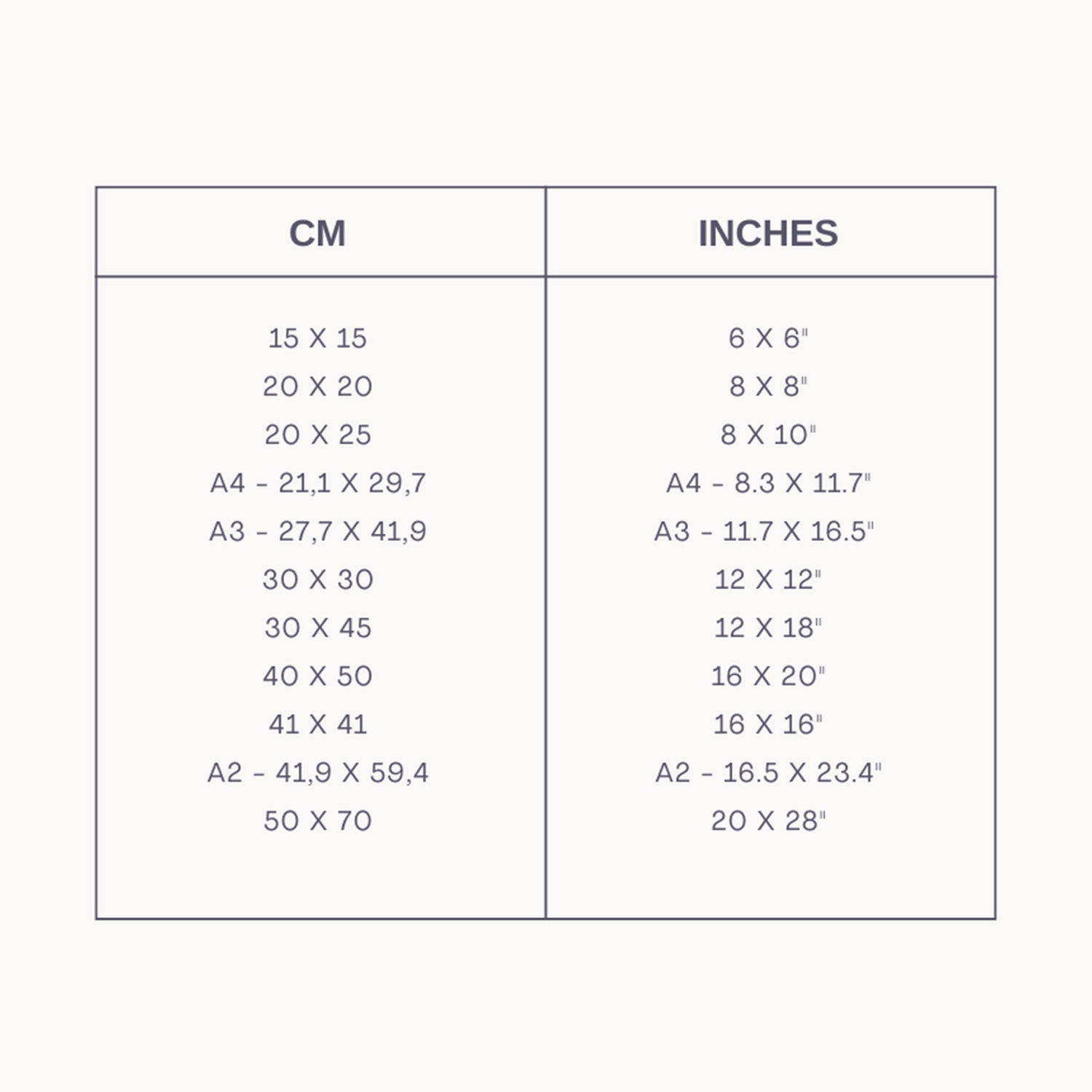 For better understanding, a conversion chart from centimeters to inches is provided, along with images illustrating each category's sizes. If a particular art piece is not available in the size you had in mind, you can always use a passepartout to adapt any fine art print or artwork to fit your desired frame.